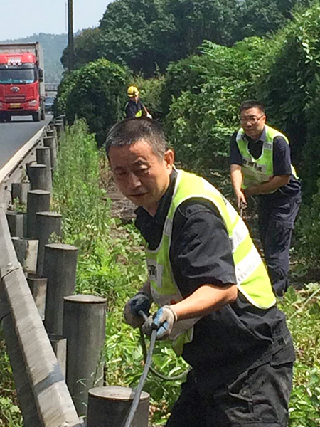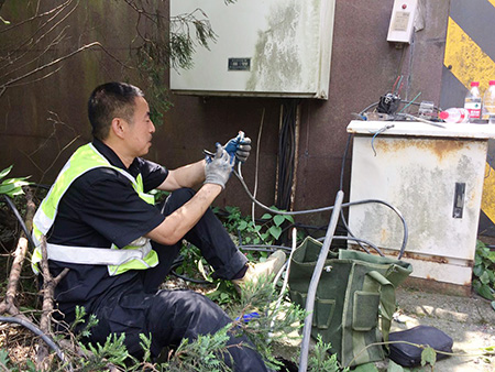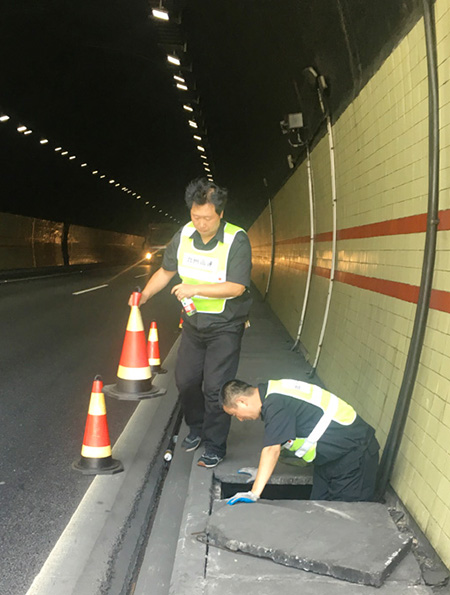 圖為修復后的隧道口路燈 對于修復被盜電纜,一般最直接的做法是重新再拉一根新電纜至配電箱,利用箱內現成的控制開關和交流接觸器等元器件,完成整個電纜連接工作,但中心隊員考慮到此種方法不僅工作量大,修復成本高,而且存在再次被盜的可能性,如果用鋁線代替,電力傳輸又要大打折扣。于是,他們另辟蹊徑,計劃從剩余配電箱至路燈還有200余米未被盜取的電纜中截取一段,直接和洞口情報板電纜相接,這樣既能節省人力、物力,又能以最快速度恢復路燈正常工作。 當天一早,中心隊員帶上相應的工具和設備直奔現場,在確認電纜位置及走向后,便著手抽離洞內電纜??紤]到洞口到配電箱電纜至少有100余米,電纜溝下面又鋪有其他眾多電纜以及之前掉落的垃圾,直接從洞口抽離根本無法動彈。于是,中心4名隊員便每隔10米左右用撬棍撬開上面水泥蓋板,整個人跳進電纜溝內,彎著腰一段一段抽離。抽到最后一個溝時,4人頂著烈日,齊力把重達近百斤電纜抽離整個電纜溝并放置在護欄內側草地上,隨后再從抽出的這段電纜中剪取適當長度,重新鋪設后與寧向出洞口的情報板電纜相接。 臨近中午,戶外溫度不斷升高,中心隊員早已濕透衣背,為趕在一天中最熱的時間點前完成任務,4名隊員臨近解決午餐又迅速奔赴現場,拆除原配電箱內的舊器件,將其用回到新的供電線路中,而多余的器件則捆綁打包帶回中心以留備用,節省公司后期維養成本。 下午1:40,經過通電測試,9盞路燈全部恢復正常工作。集團總工程師江輝在工程部微信群里肯定了中心工作,并提醒一線人員切記做好防暑降溫工作,注意自身身體狀況。