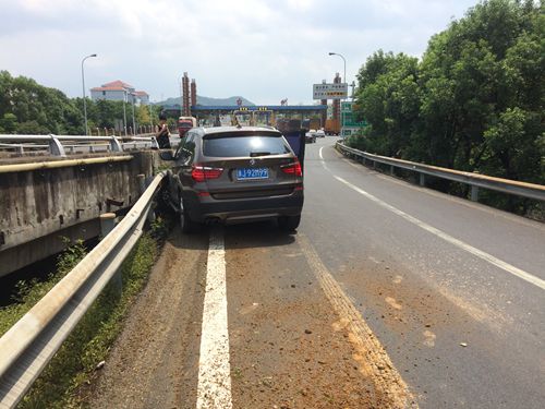 8月13日上午10:30分左右,臺(tái)州收費(fèi)所出口寧向匝道口有一輛黑色寶馬X3斜靠在護(hù)欄旁,其車頭左側(cè)因碰撞護(hù)欄而嚴(yán)重凹陷,左前輪胎報(bào)廢。 當(dāng)時(shí),該所出口五號(hào)車道的欄桿發(fā)生故障,需要暫時(shí)關(guān)閉進(jìn)行維修。班長(zhǎng)張海勇在內(nèi)廣場(chǎng)引導(dǎo)車輛時(shí)發(fā)現(xiàn)此起事故,走近細(xì)看,由于碰撞激烈該車前檔玻璃破裂,前排安全氣囊彈出,而車旁的兩個(gè)人驚恐未定不知所措。此時(shí)匝道口車流不斷,因駕駛員遲遲找不到三角牌,為避免二次事故的發(fā)生,張海勇在車后方指揮交通,并提醒車旁人員站在護(hù)欄外安全位置,同時(shí)報(bào)告指揮中心事故車的位置和損傷情況。