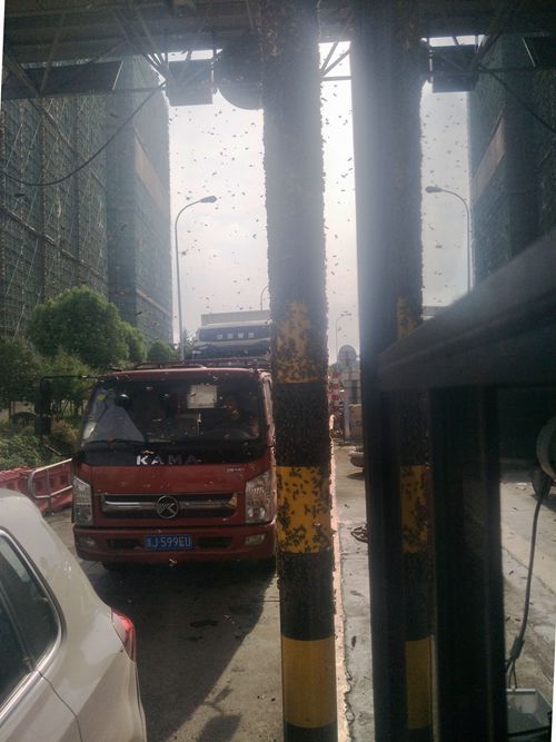 圖為蜜蜂集聚在收費站 原來這輛綠通車運輸蜂箱,由于蜂箱沒有關(guān)閉嚴實,在車通過車道檢查稍作停留時,大量的蜜蜂乘機逃出,圍攻收費崗?fù)ぃ炜账查g一片密密麻麻。它們有的停留在車道的防撞柱上,有的在收費窗口附近盤旋,遲遲不肯離開,嚇得過收費站等待繳費的司機不敢開車窗繳費。