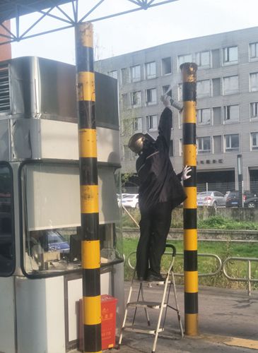 圖為工作人員用殺蟲劑噴射蜜蜂 當(dāng)班副班長何丹燕立即將車道內(nèi)情況報告給所領(lǐng)導(dǎo),副所長何先林聽聞后急急披上雨衣,戴上頭盔和手套,迅速趕到車道,經(jīng)過簡單防護的他用殺蟲劑噴射蜜蜂集聚的位置。與此同時,何丹燕疏導(dǎo)后方車輛從其他車道通行。