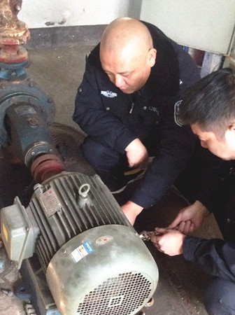 圖為工作人員修理水泵電機現場 因設備比較陳舊,而且原圖紙等資料不全,構造原理無從了解,黃土嶺隧道所所長助理金衛軍帶領執勤隊,一邊推測,一邊根據水泵工作原理和電器修理經驗尋找故障點,對設備可能出現的問題進行反復推敲,逐一排查,最終確定為上水位控制繼電器觸點接觸不良造成導電故障。經過對觸點的調整和修復,以及對軸承部位進行加油和電機、水泵平衡重新調節后,設備之前出現的電機震動、聲音異?,F象和無法自動進水等問題被一一解決,消防水泵恢復正常運作。 此次檢修工作不僅及時消除了安全隱患,確保設備隨時處于良好的待命狀態,在檢修的過程中,也為隊員開展了一次良好的技術培訓。 毛譯聆