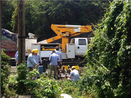 圖為執(zhí)勤人員配合供電部門安裝高壓線路