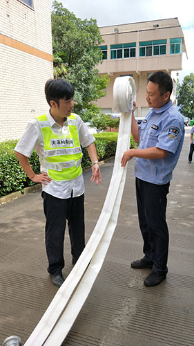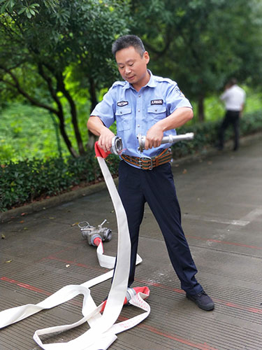 圖為主講人馮常敏操作示范現場 現場,“馮大師”腳下放著兩盤水帶,站姿已成“丁”字步,雙腿微曲,兩拇指與食指握住水帶根部,使虎口以順時針方向對準接口處,做好甩開的準備?!八Φ谝槐P水帶,要運用手腕的力量,要提起水帶并高于地面20到30厘米,再用大臂帶動小臂的力量向前甩出。” “馮大師”耐心地指導。 接下來是兩盤水帶連接的關鍵時候,“馮大師”左右手熟練操作,將如何連接的操作細節一一展現出來,同時邊操作邊說明注意事項,整套動作連貫又迅速,操作一氣呵成,一旁的新人仔細觀摩學習。