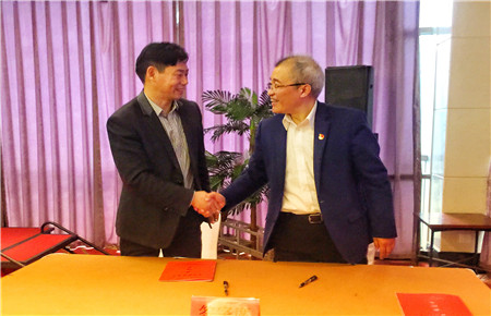 圖為集團(tuán)副總經(jīng)理陳保衛(wèi)與國(guó)資委主任徐豪簽訂責(zé)任書后握手