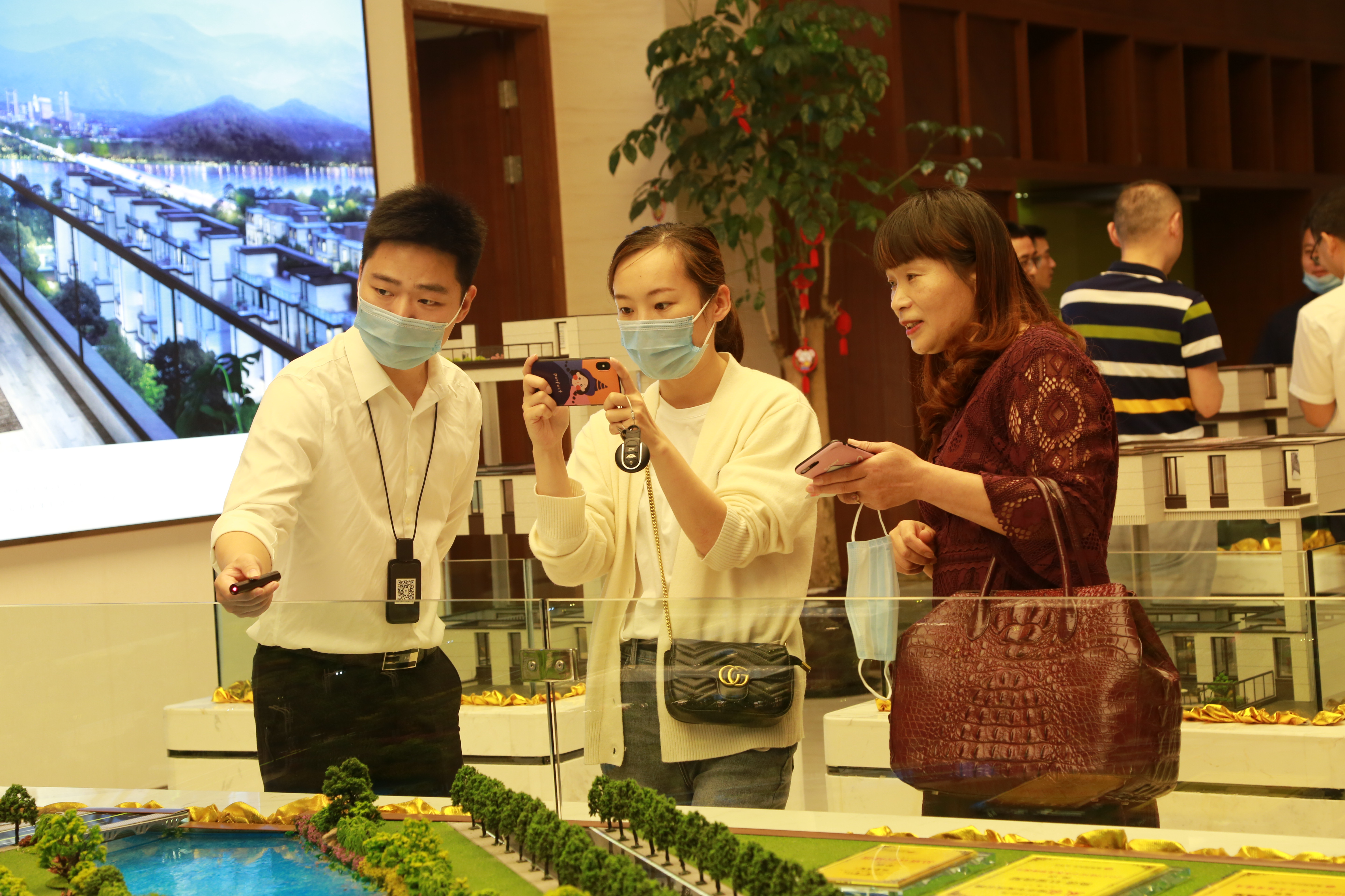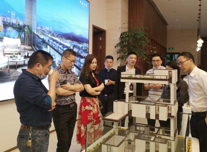 圖為陳文波對(duì)照?qǐng)D紙了解樓盤(pán)情況 在銷售展廳樓盤(pán)沙盤(pán)前,陳文波聽(tīng)取了高速房產(chǎn)(集團(tuán))公司負(fù)責(zé)人關(guān)于玖璽逸墅項(xiàng)目銷售計(jì)劃、認(rèn)籌客戶等情況匯報(bào)。他對(duì)前期房產(chǎn)公司的辛苦付出給予充分肯定,要求大家認(rèn)真服務(wù)好每一個(gè)來(lái)訪客戶,彰顯出國(guó)企品質(zhì),全力做好銷售工作。 當(dāng)天,銷售展廳樓內(nèi),陸陸續(xù)續(xù)有客戶進(jìn)出,“我很早就看中這個(gè)樓盤(pán)了,不僅位置好,而且采光好、通風(fēng)好,居住在這里一定非常舒服。”一名準(zhǔn)客戶張女士夸贊道,今天她特意前來(lái)交付認(rèn)籌金。  圖為客戶在疊墅沙盤(pán)前參觀