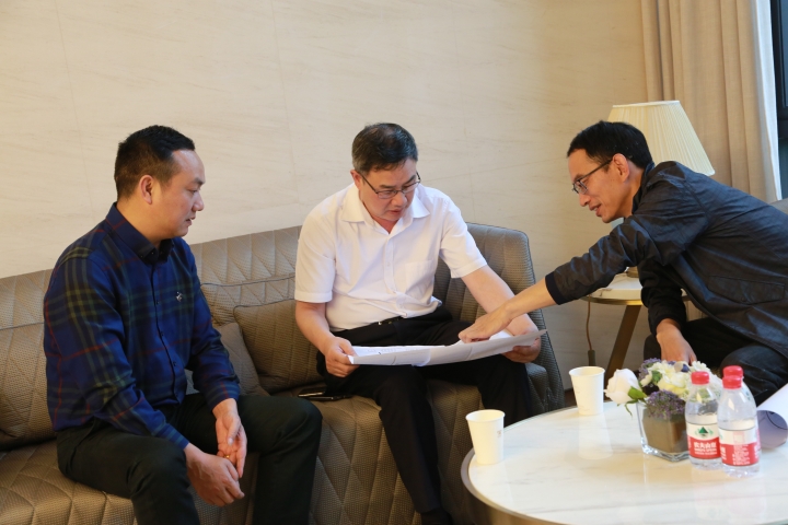 圖為陳文波等領(lǐng)導(dǎo)在沙盤(pán)前聽(tīng)取有關(guān)開(kāi)盤(pán)工作匯報(bào)
