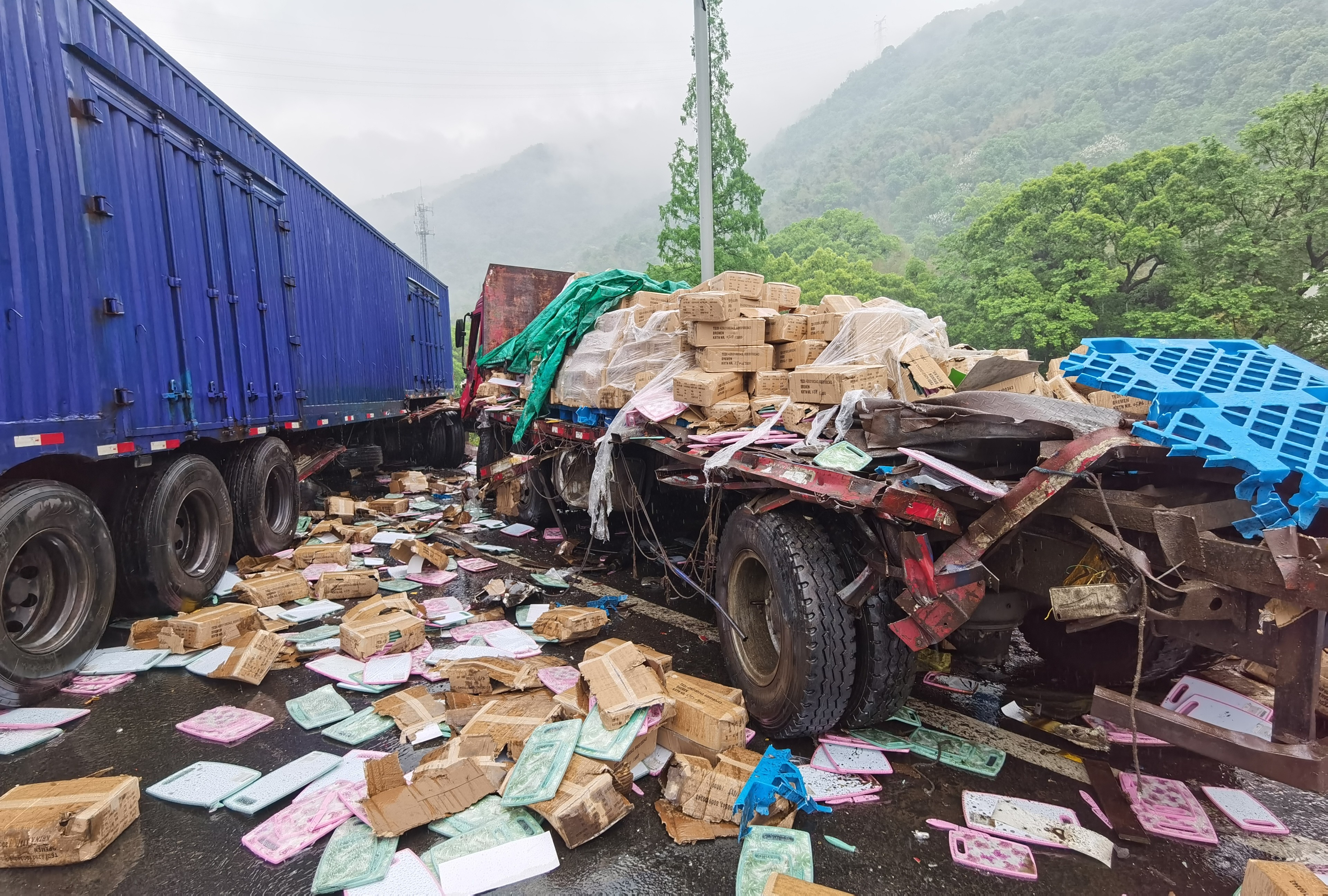 隨后,拖車、救護車、吊車相繼到達,所有人員立即有序分工,因大貨車車頭卡在護欄,需要切割,拖車難度較大需要吊車將其拖出,現場救援緊急開展。隧道所工作人員協助駁貨車清理貨物和散落的車架,保證高速路面通暢。 后經詢問了解,平板貨車因車輛拋錨停在黃土嶺寧向洞口200米處,雖然已將安全警示牌放在車輛后方,但車輛未完全停靠邊上。后方一輛箱式貨車發現時緊急剎車,由于當時正下大雨路面濕滑,緊急制動后車輛發生擺尾失控,司機急打方向想要救車阻止,但是依然撞上了前方的拋錨貨車。 再次提醒廣大司乘人員,雨天路滑,要控制車速保持車距離,遇車輛拋錨,車靠邊人撤離,并撥打高速救援電話12122。 蔣弓
