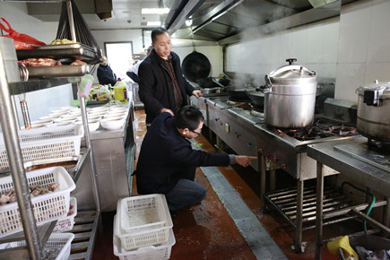 圖為公司副總經(jīng)理董阿林在食堂檢查用火器具