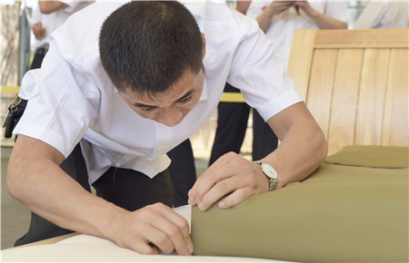 圖為教官為各位選手的“豆腐塊”裁判打分 這是集團2018年技能大比武中內務項目比賽中的一個場景。此次內務比賽由公司大樓、所、中心、子公司共挑出33名代表參加,比賽特邀黃巖消防大隊兩位教官擔任裁判。