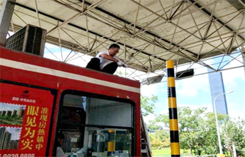圖為收費(fèi)所員工正在加固崗?fù)た照{(diào)外機(jī)