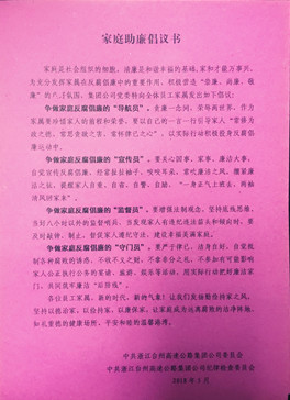 為充分發(fā)揮員工家庭成員在黨風(fēng)廉政建設(shè)中監(jiān)督預(yù)防的特殊作用,根據(jù)集團(tuán)“廉政教育月”活動(dòng)要求,5月30日,監(jiān)察室向全體員工發(fā)放了一封以“傳承好家風(fēng),共建廉之家”為內(nèi)容的《家庭助廉倡議書(shū)》,讓廉潔文化走進(jìn)家庭,成為家庭美德,更好地發(fā)揮家庭成員在廉政建設(shè)中的特色作用。
