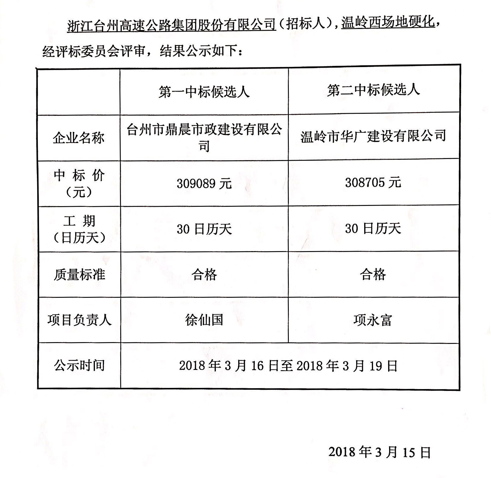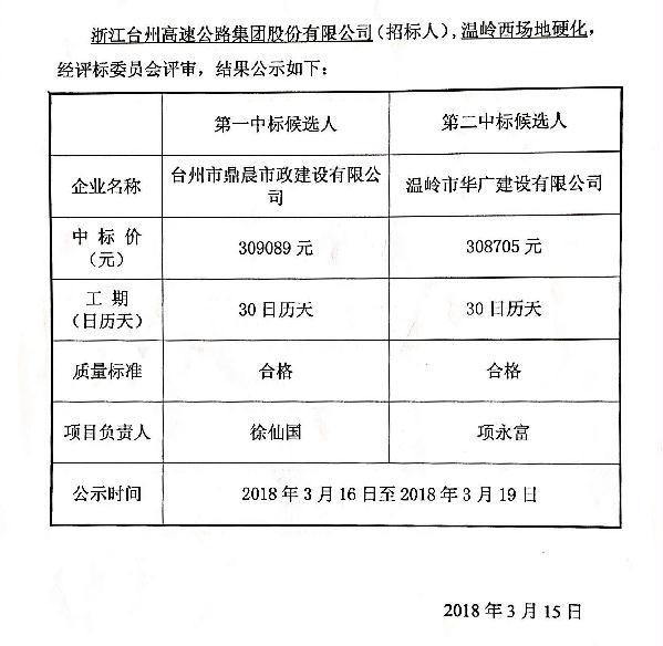溫嶺西場(chǎng)地硬化工程中標(biāo)候選人公示單