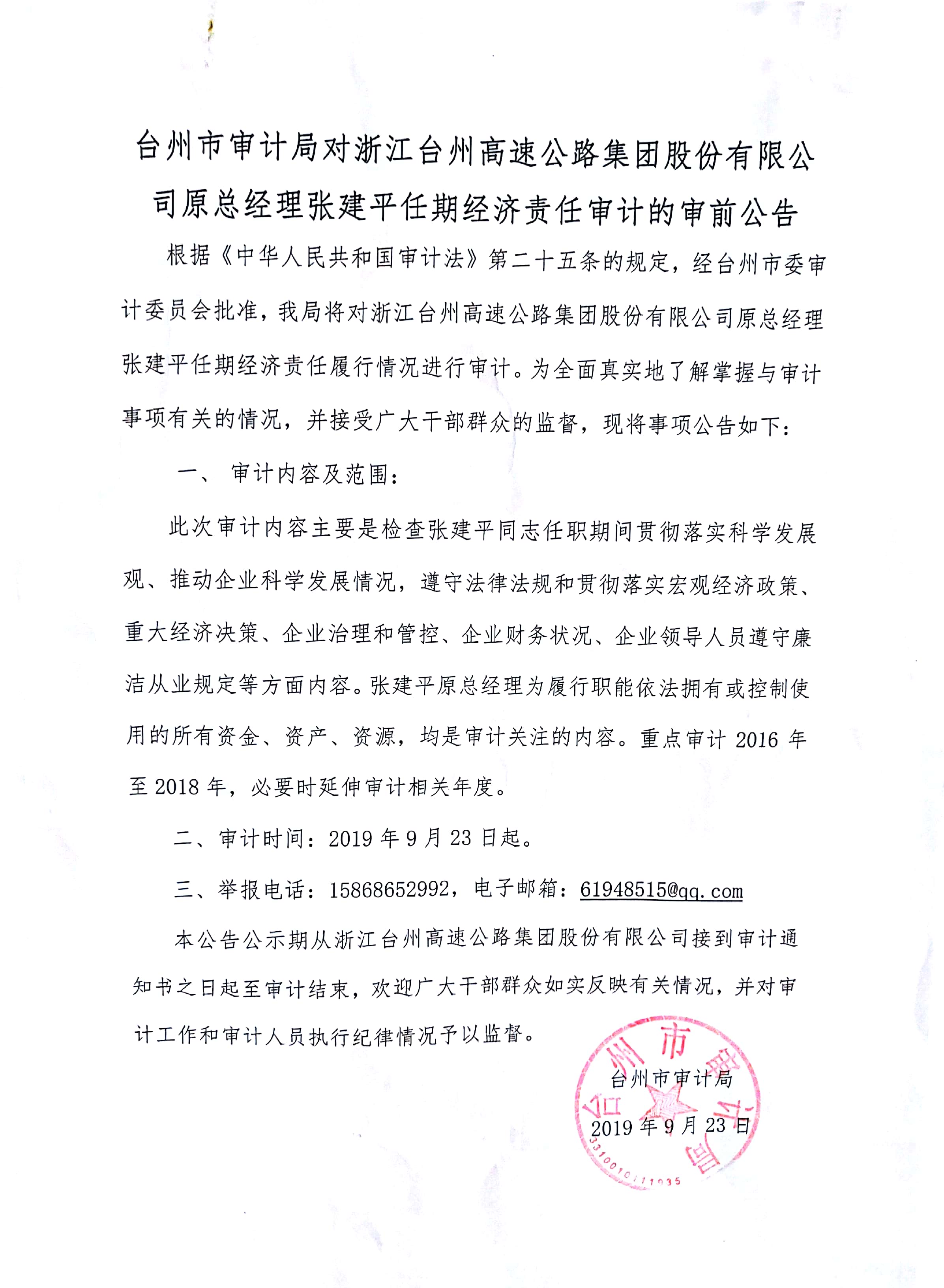 臺州市審計局對浙江臺州高速公路集團股份有限公司原總經理張建平任期經濟責任審計的審前公告