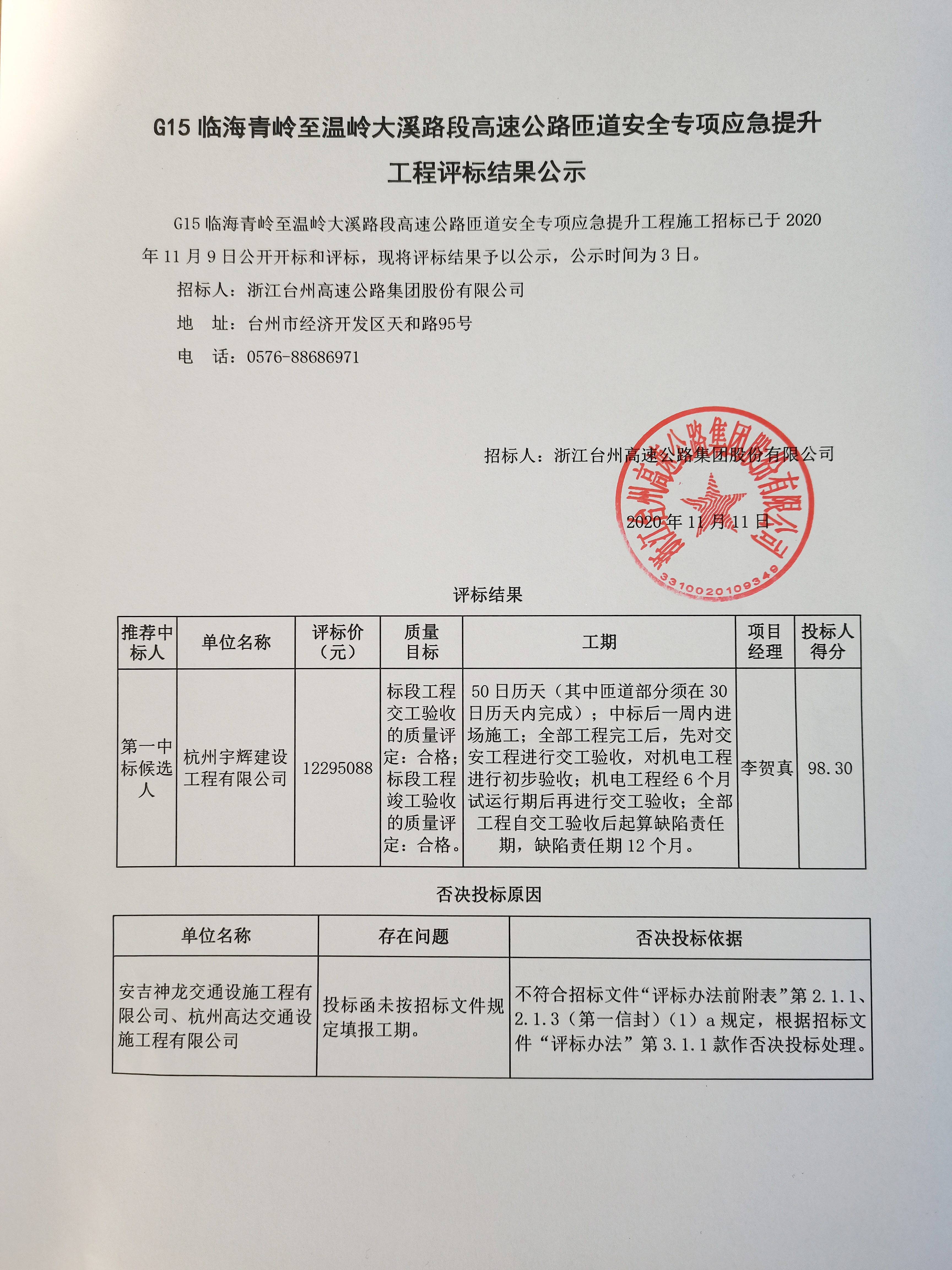 G15臨海青嶺至溫嶺大溪路段高速公路匝道安全專(zhuān)項(xiàng)應(yīng)急提升工程評(píng)標(biāo)結(jié)果公示