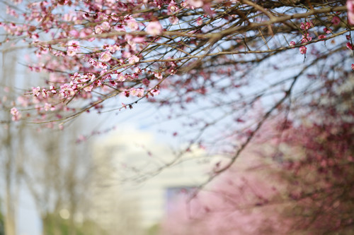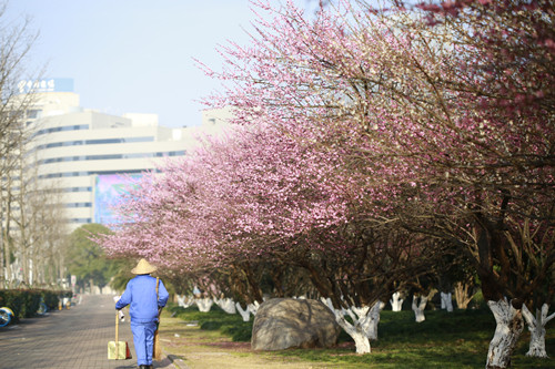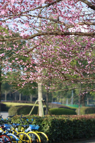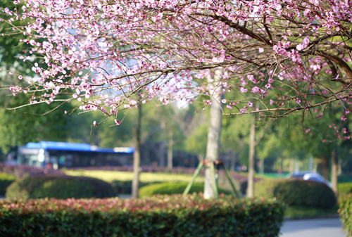 最后一站,便是市民廣場,我見過的最美公交站臺(tái)。初春的清晨啊,一下車便有沁香拂散,迎接我下車的那是大片繁花盛開呀,路邊草地一溜的紅梅、白梅,在藍(lán)天下絢爛地肆無忌憚地綻放。呵,是的,還有藍(lán)天,最近流行的一個(gè)詞叫“臺(tái)州藍(lán)”,忽然想起來,每日公交車上下班,低碳出行,這算是我為“臺(tái)州藍(lán)”添了一筆淡藍(lán)嗎?應(yīng)該是吧。于是,在藍(lán)天紅白花海中,慢慢穿過梅林、小橋、亭子,上班之路竟是如此心情舒緩。 鄭蔚